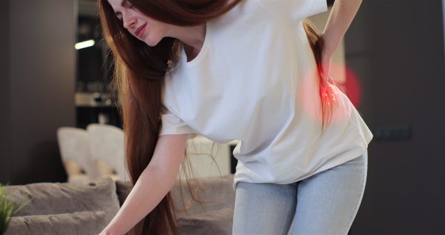girl-suffers-from-backache-feeling-badly-sitting-on-couch-in-living-room-at-home-3d-an-SBI-350092082