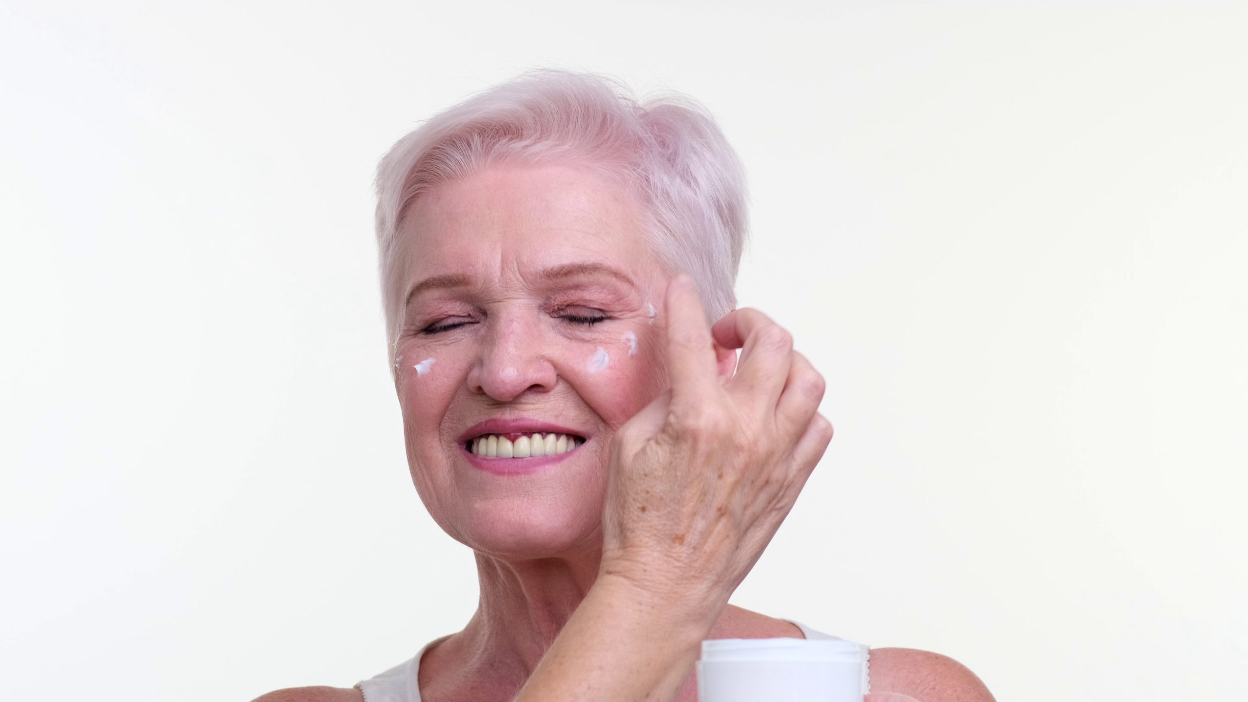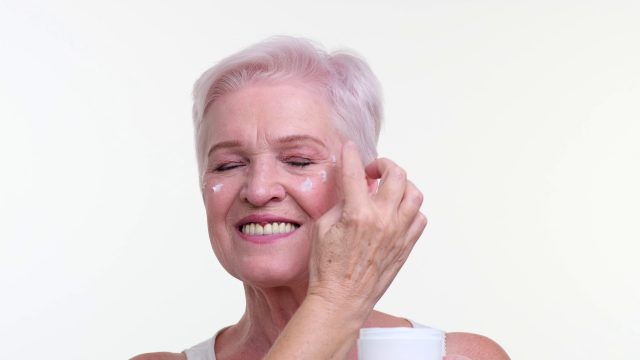 old-woman-applying-face-cream-and-smiling-on-white-background-SBI-351104658