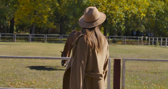young-caucasian-girl-in-elegant-coat-and-hat-walking-along-corral-with-graceful-brown–SBI-350651573